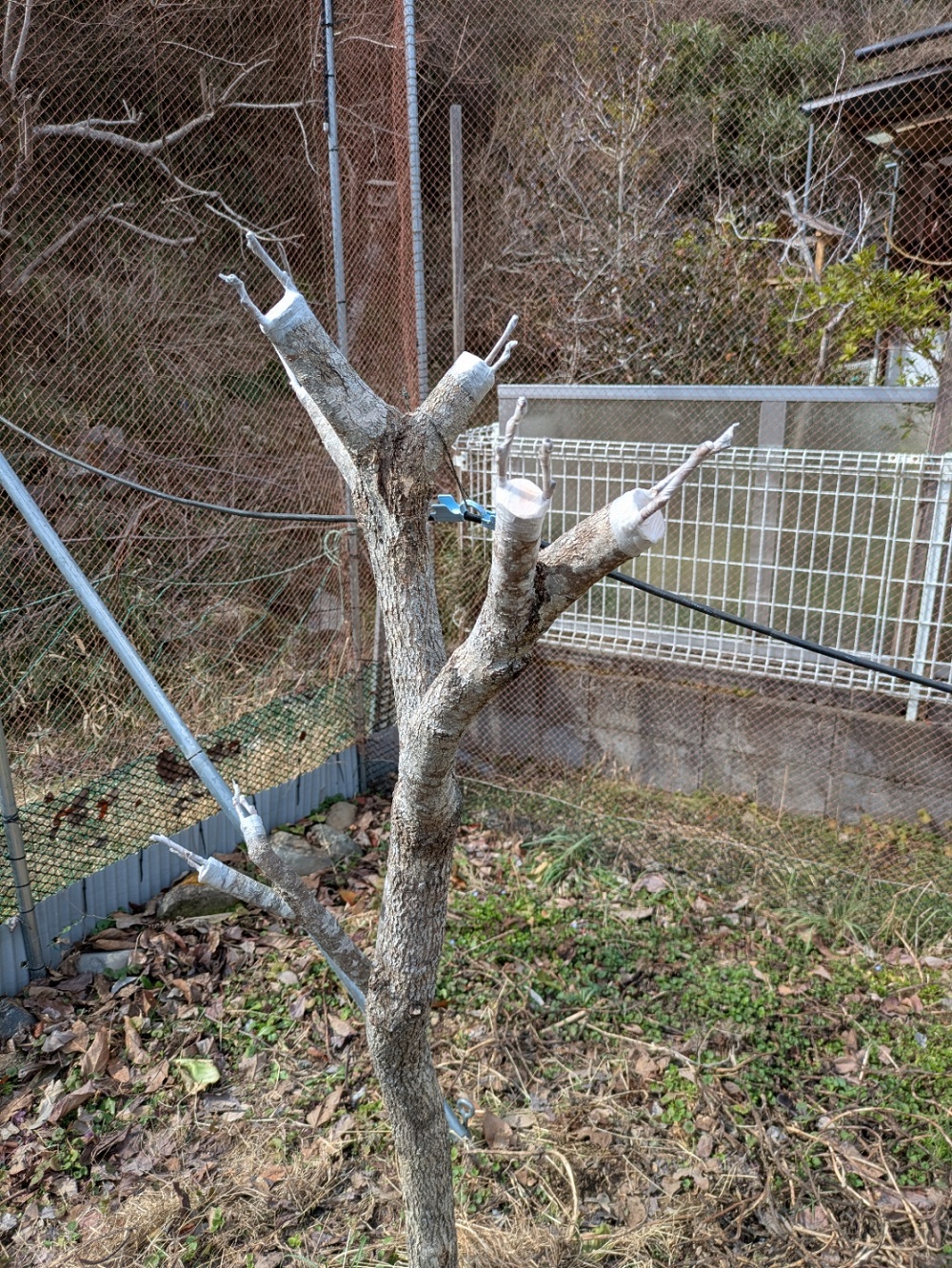 柿の品種は忘れましたが柿の実が色ずく前に柔らかくなってしまい収穫のタイミングが難しいため、畑の中でいい柿の実が生る木の枝を接木することにしました。4月頃になれば成否が分かるでしょう。