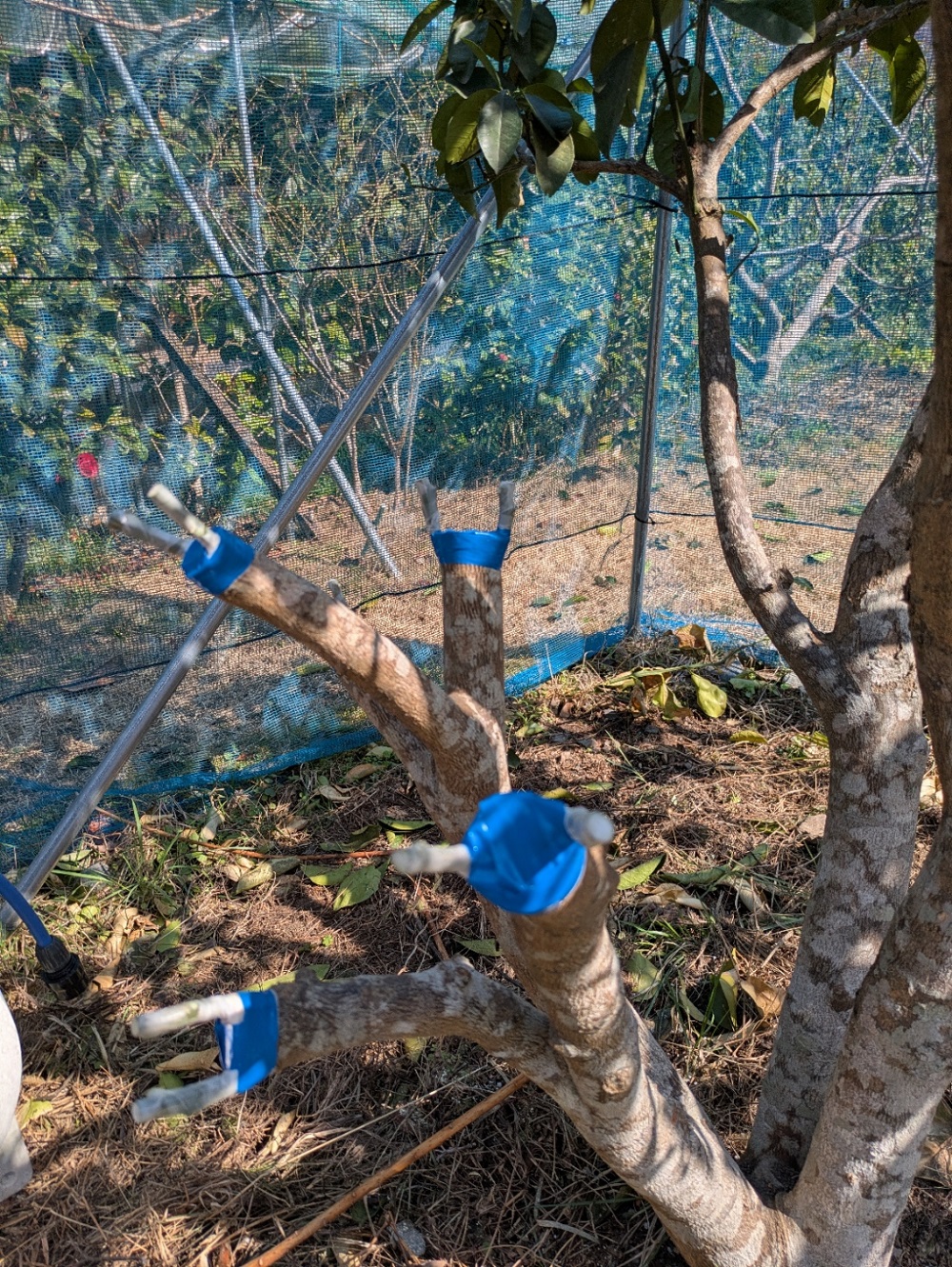 こちらは八朔の木です。枝の半分ほどを切りスルガエレガントの枝を接ぎました。接ぎ木が成功することを願っています。
