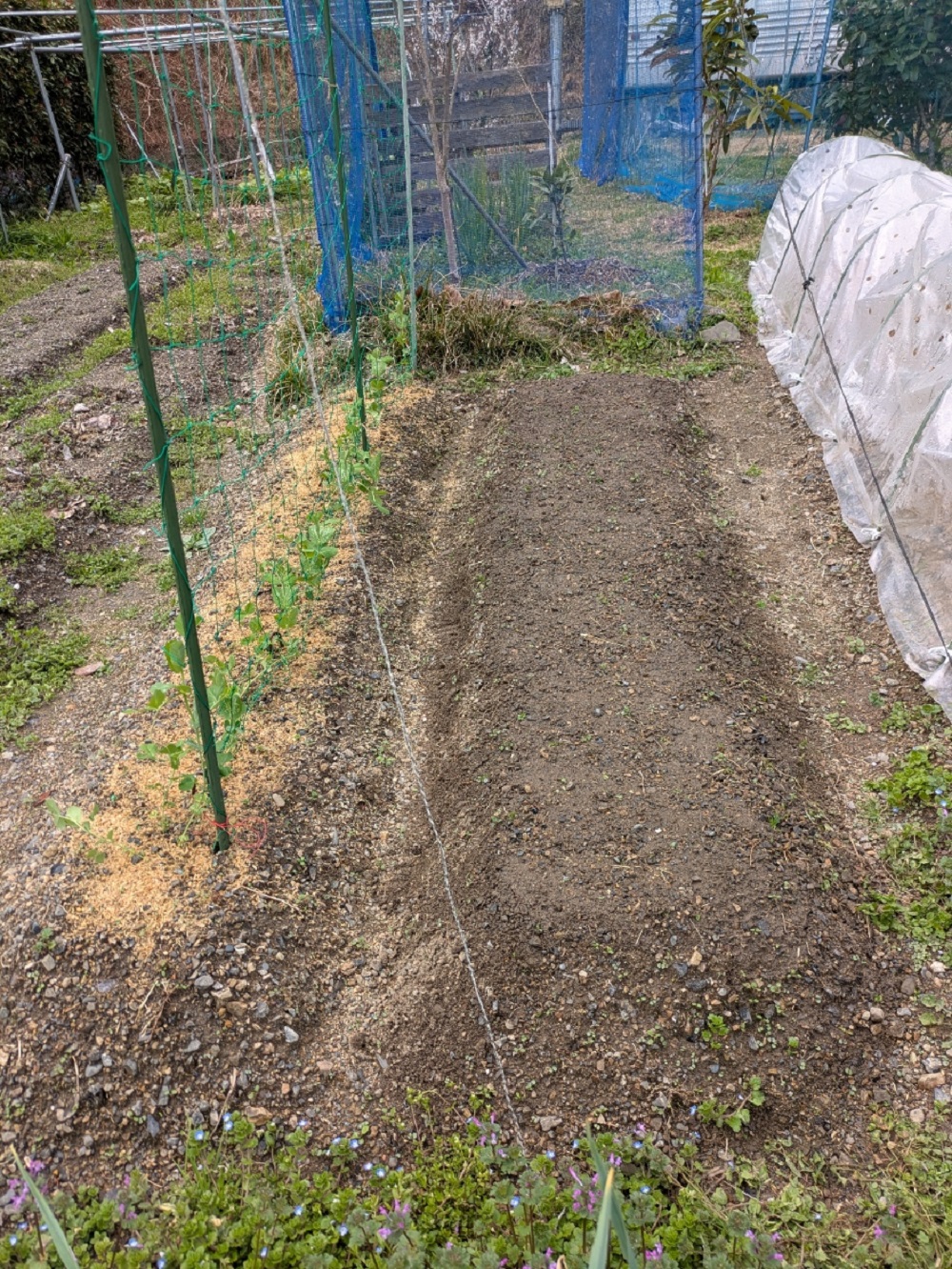スナップエンドウの隣にツルありインゲンの種まきをしました。少し早いかもしれませんが、暖かくなってきたのでたぶん育つでしょう。