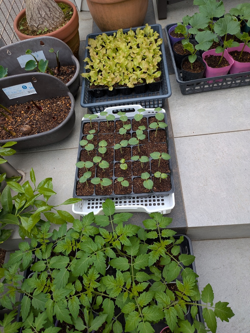 下はトマトの苗です。花芽が出るのを待って畑に植えます。
