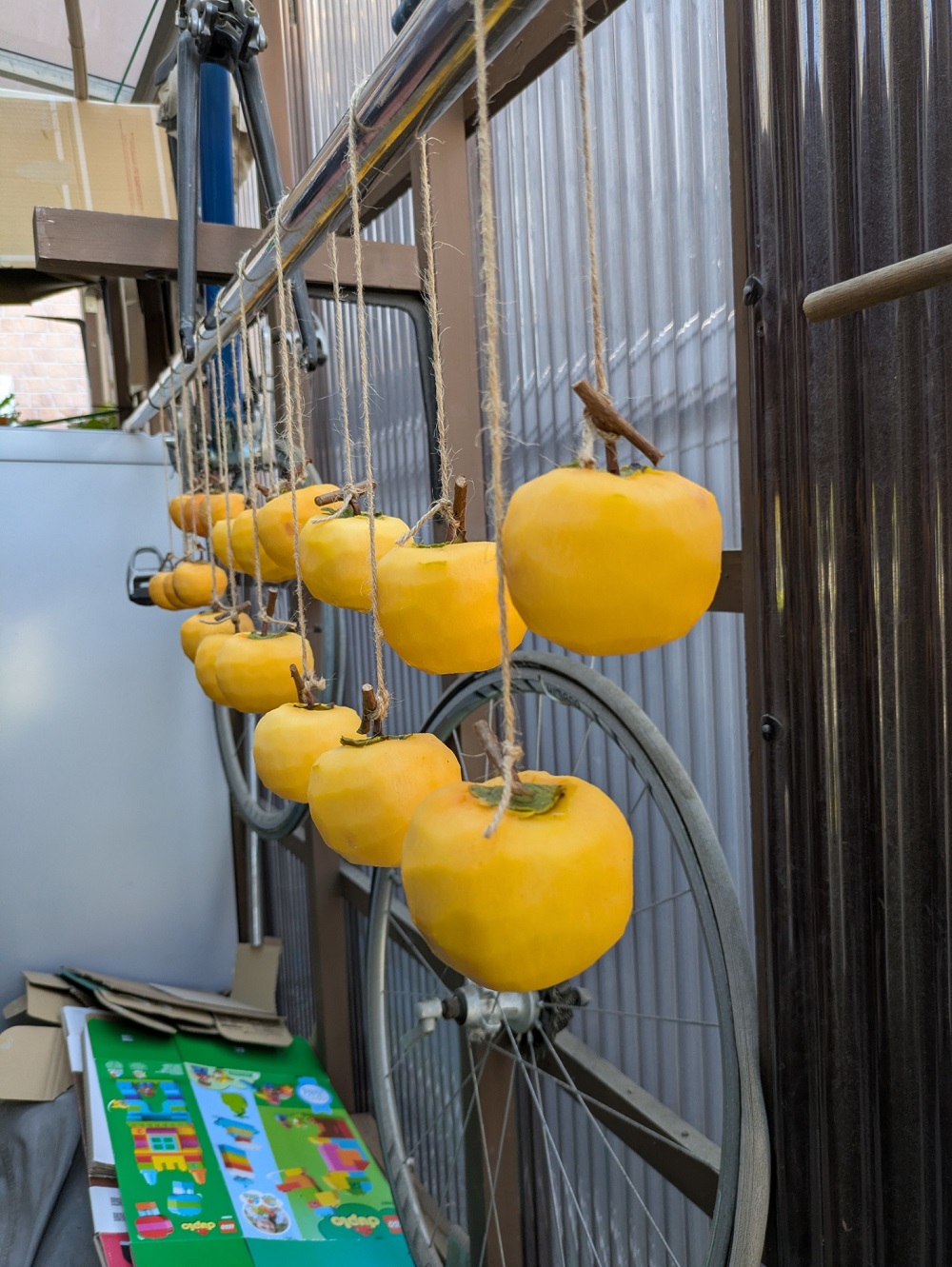 干し柿作り 2025/11/16 柿 家の近くの無人販売で渋柿を売っていたので、久しぶりに干し柿を作る事にしました。 干し柿作りは簡単、⓵皮をむいて⓶熱湯で5秒位消毒して⓷紐で吊るして 甘くなるのを待つだけです。