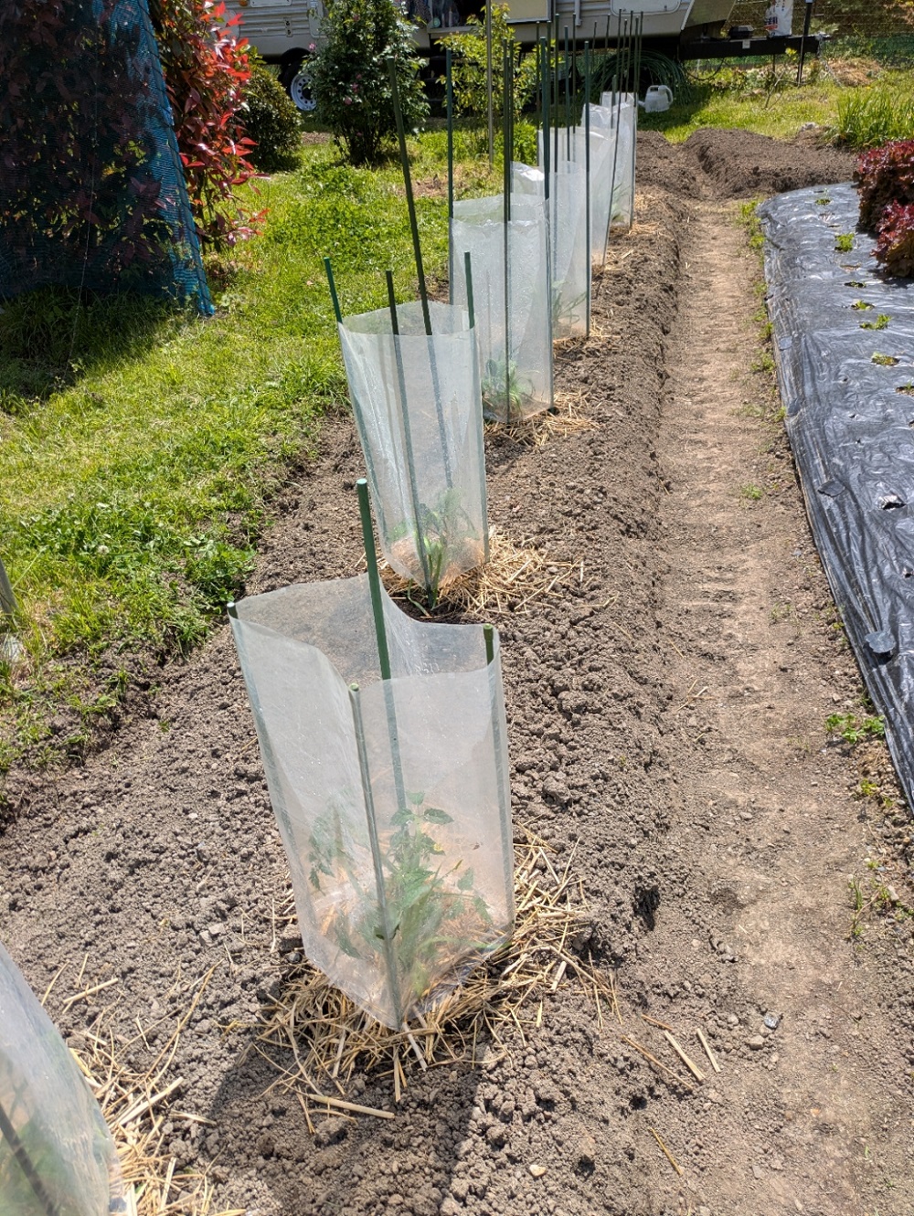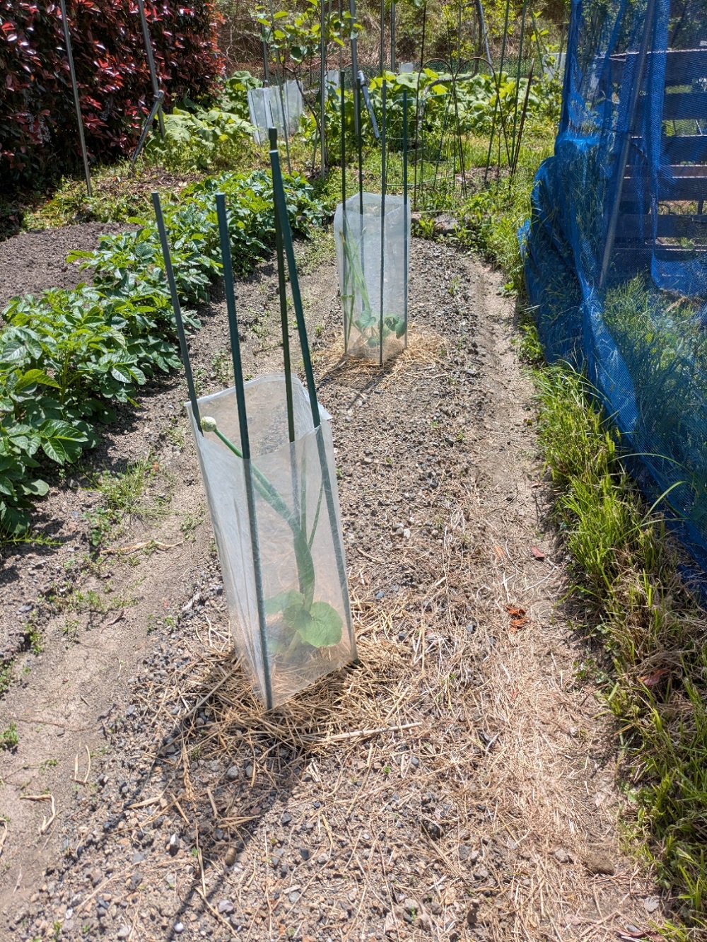 夏野菜の植え付け 2026/4/19 かぼちゃ, スイカ, トマト, ナス, ピーマン, 里芋 購入した夏野菜の苗(カボチャ、スイカ、ピーマン、ナス、トマト、里芋)を植えました。 こちらはトマト ナス科にはコンパニオンプランツとしてニラを混植しました こちらはカボチャ ウリ科にはネギを混植しました